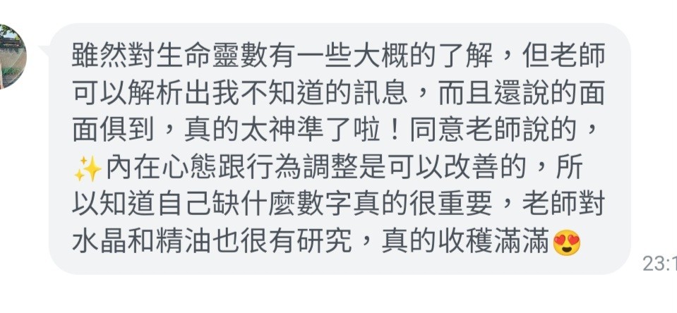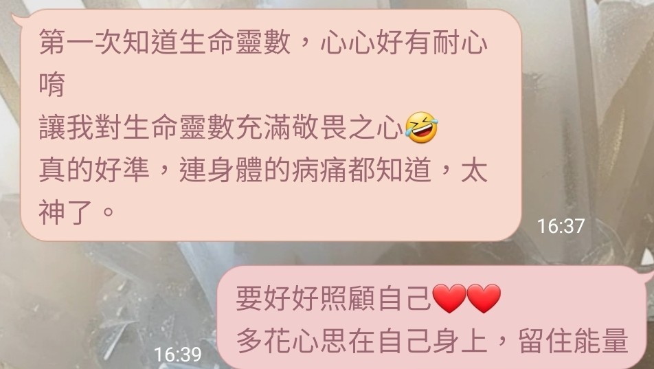 再者依照生命靈數命盤開始解析、深入剖析你的情緒及特質,需要時會結合精油牌卡給予你需要的排解方式。