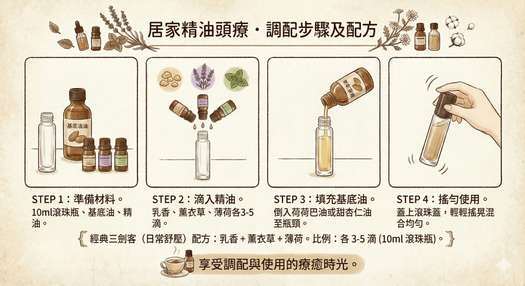 - 分線滴入: 將上述精油滴入基底油(如分餾椰子油),均勻滴在頭皮各處。