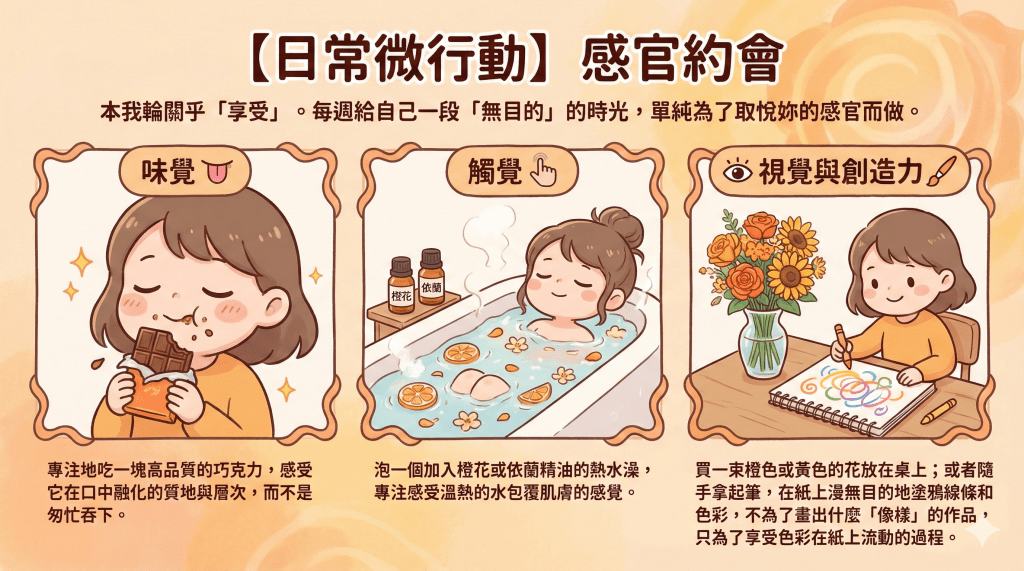 本我輪關乎「享受」。每週給自己一段「無目的」的時光,單純為了取悅妳的感官而做。